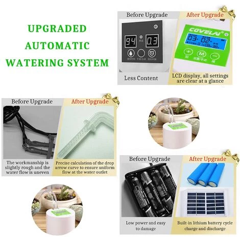 Deux façons de charger : faites fonctionner ce système d’irrigation goutte à goutte via un panneau solaire ou une connexion USB. La production d’énergie solaire adopte une minuterie de conception de panneau solaire, qui peut absorber l’énergie solaire comme source d’alimentation, économie d’énergie et protection de l’environnement