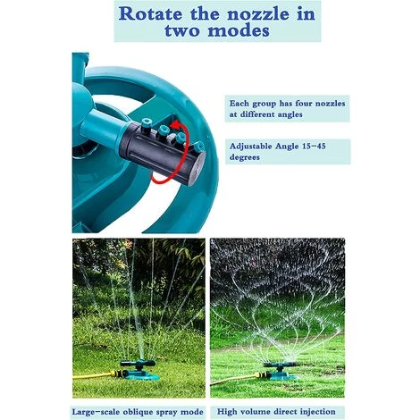 - Pratique et facile à utiliser : il suffit de connecter l’arroseur au tuyau et de l’allumer. La tête d’arrosage automatique n’a besoin que de quelques secondes pour l’installer. Ajustez les buses de 15 ° à 45 ° pour obtenir la vitesse de rotation souhaitée et l’angle de pulvérisation pour garantir une couverture complète.