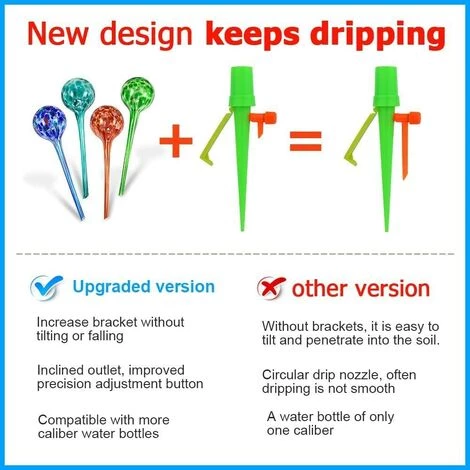 [PROFITE DE TES VACANCES] – Profitez du temps avec votre famille, vos plantes me laissent. Utilisez des pointes d’arrosage automatique, vous pouvez aller vous détendre sans avoir à vous soucier de vos plantes. Notre système d’arrosage automatique idéal pour arroser les fleurs d’intérieur, les plantes d’extérieur ou vos légumes pendant les vacances [FLUX D’EAU RÉGLABLE] – Interrupteur réglable, contrôle de flux précis. Ces dispositifs d’arrosage des plantes avec vanne de régulation permettent de contrôler la vitesse de goutte-à-goutte 0-60s / 1 goutte à goutte, les gouttes à libération lente vers les stations d’auto-arrosage, durent 1 à 15 jours ou plus, en fonction du temps dont vous avez besoin. Quantité exacte d’eau, ne devenez pas un tueur de plantes [FACILE À UTILISER] – Sans installation fastidieuse, il suffit de percer un petit trou dans le fond de la bouteille pour permettre l’évacuation des gaz et de resserrer les dispositifs d’arrosage pour irrigation goutte à goutte, puis d’une vanne de régulation permettant de régler la vitesse du flux. Insérez-le dans le sol, pas besoin de clou et pas de danger [BOUTEILLES COMPATIBLES] – Les globes d’arrosage des plantes sont compatibles avec les bouteilles dont l’intérieur est de 1,1 pouce. [SPIKES D’ARROSAGE AUTOMATIQUE] – Appareil d’arrosage parfait pour vos légumes, jardin extérieur intérieur, plantes aquatiques au jour le jour, plantes en pot, plantes d’intérieur, herbes, plantes de terrasse, paniers suspendus, pots de bureau, plantes suspendues, petits arbres, arbustes Il peut économiser votre temps et votre énergie sans avoir à arroser tous les jours, et vous évite d’avoir à transporter des arrosoirs lourds
