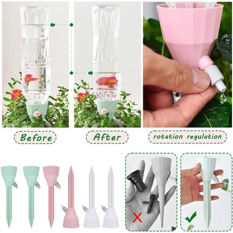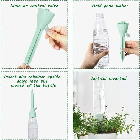 Facile à utiliser : une seule pièce, aucune installation requise. Aucun outil requis, pas besoin de percer des trous dans la bouteille. Fixez simplement l’unité d’arrosage à l’embouchure de la bouteille, puis retournez la bouteille et enfoncez les clous dans le sol. Pas besoin de se soucier de la pression de l’eau, pas de fuite d’eau