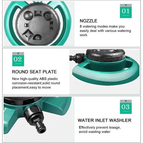 【8 modèles d’eau】Cet arroseur à tourelle a 8 modèles d’eau, parfaits pour l’entretien des pelouses et des jardins. Conception de plaque ronde pour un rangement et un déplacement pratiques.