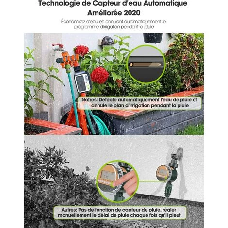 - Version améliorée du capteur de pluie: Adoptant la dernière technologie de capteur de pluie, programmateur d’arrosage surveille les précipitations en temps réel avec un module de capteur haute sensibilité, puis met en pause votre plan d’irrigation en interrompant la vanne. Au fur et à mesure que le capteur de pluie sèche tout comme le sol, la minuterie d’arrosage se remet en marche comme prévu.