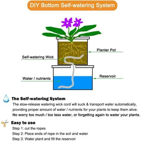 Système d’arrosage automatique DIY: placez une extrémité à une source d’eau en quantité suffisante, la mèche aspirera automatiquement l’eau à l’autre extrémité et s’égouttera dans les 15 minutes (le temps réel dépend de la longueur et du contrôle de la vitesse d’égouttage ; ou faire tremper la corde dans l’eau, il s’égouttera instantanément). Ce système d’arrosage automatique simple et économique, aide à prendre soin de vos plantes lorsque vous partez en voyage ou en voyage d’affaires.