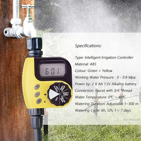 Plusieurs modes : la minuterie d’arrosage offre une variété d’options de durée et de fréquence d’arrosage. Temps d’arrosage : 1 minute à 240 minutes, fréquence d’arrosage : 6 heures, 1-7 jours. Vous permet de définir votre propre programme d’arrosage personnalisé.