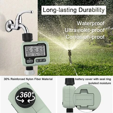 【Multifonction et polyvalent】 Le mode retard de pluie retardera votre programme au prochain cycle d’irrigation pour éviter un arrosage excessif. Le mode de verrouillage enfant aide à prévenir les déclenchements involontaires ou le gaspillage d’eau. Cette minuterie d’arrosage peut être utilisée pour arroser vos cours, systèmes d’irrigation goutte à goutte, eau pour animaux de compagnie et irrigation par aspersion, etc.