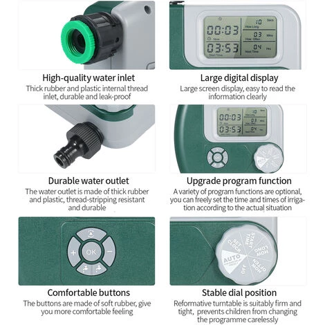 | Avec cette minuterie d’arrosage programmable, plus les pelouses détrempées ou les plantes mortes dans le jardin à cause de votre oubli. Caractéristiques: Caractéristiques: |