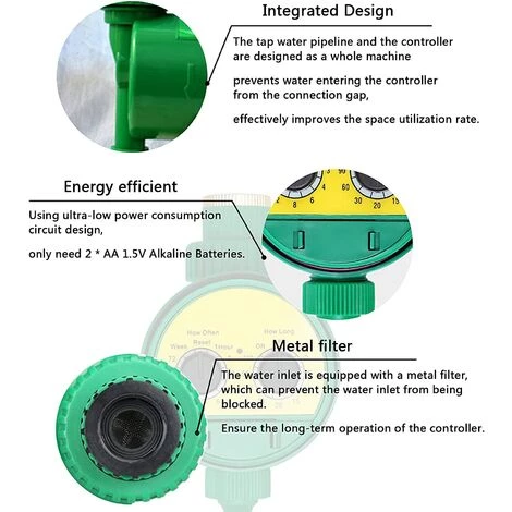 La minuterie d’eau est fabriquée à partir de plastique ABS durable. Et avec fonction de mémoire permanente, pas besoin de réinitialiser le programme. Cette minuterie électronique est conçue pour le contrôle des arroseurs et des systèmes d’eau / d’irrigation.