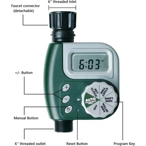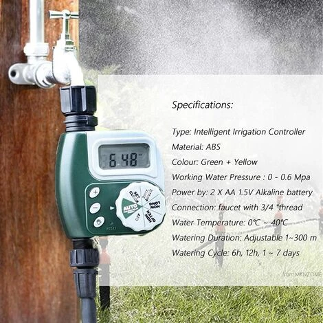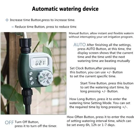 La minuterie d’eau est fabriquée à partir de plastique ABS durable. Et avec fonction de mémoire permanente, pas besoin de réinitialiser le programme. Cette minuterie électronique est conçue pour le contrôle des arroseurs et des systèmes d’eau / d’irrigation.