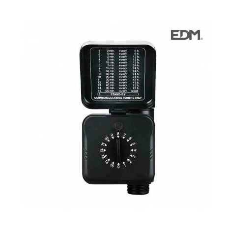 programador analogico de riego edm 15 programas diferentes. programable la frecuencia y duracion del riego. programacion diaria. presion de funcion 1 a 7bar incluye 2 roscas de 3/4″ – 1″ (funciona con 2 pilas aa no incluidas) material: polipropileno. tratamiento anti uv