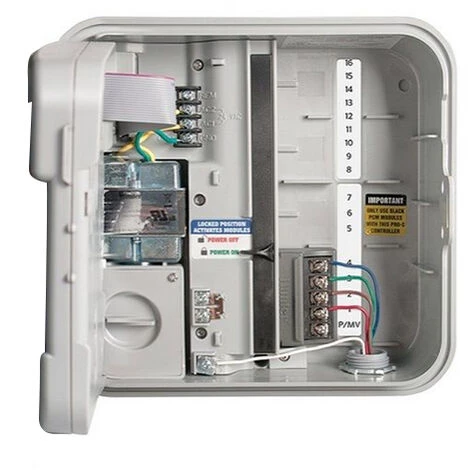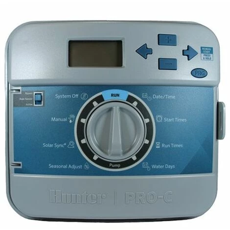Pro-C est le programmateur de choix pour les installateurs de systèmes de contrôle de l’arrosage résidentiel. Depuis 2001 Pro-C s’est révélé être le programmateur le plus fiable et le plus robuste de l’industrie. Il a la capacité de s’étendre grâce à sa conception modulaire. Mémoire easy retrieve : Utilitaire de sauvegarde manuelle permettant d’enregistrer la programmation complète et les informations de configuration d’un programmateur dans la mémoire de secours. Il est ainsi possible de récupérer à tout moment le programme d’arrosage enregistré. Cette fonction peut être utilisée pour rétablir les réglages initiaux d’un programmateur après toute intervention ou au début d’une nouvelle saison.La protection automatique contre les courts-circuits est une fonctionnalité présente sur tous les programmateurs Hunter fonctionnant sur secteur. Elle détecte automatiquement les défaillances électriques généralement dues à des problèmes de câblage. Les stations présentant des courts-circuits sont ignorées, ce qui permet de poursuivre l’arrosage pour les stations non défectueuses. Il n’existe aucun risque de fusible grillé ou de déclenchement de disjoncteurs internes pouvant occasionner une désactivation complète de l’arrosage.La fonction Quick Check permet d’établir un diagnostic rapide des problèmes de câblage sur le terrain, d’une simple pression d’un bouton. Quick Check affiche un message ERR en cas de détection d’un court circuit sur un numéro de station spécifique.Ajustement saisonnier: global ou mise à jour automatique avec Solar Sync : Cette fonction permet de régler rapidement les durées d’arrosage par le biais de pourcentages. Lors de la saison d’été, placez le réglage saisonnier sur 100 %, quelle que soit l’utilisation. Si les conditions météorologiques nécessitent moins d’eau, entrez le pourcentage approprié (ex. : 50 %) pour réduire les durées d’arrosage sans devoir régler chaque station du programme. Ce modèle propose deux méthodes différentes d’utilisation du réglage saisonnier pour réduire la consommation d’eau : Global et Quotidien.- Global: l’option Global permet de déterminer une valeur de réglage saisonnier exprimée en pourcentage pour toutes les durées d’arrosage, pour tous les programmes du programmateur.- Quotidien: grâce à l’ajout d’une sonde Solar Sync ET, le modèle est en mesure de mettre en ?uvre des réglages quotidiens en fonction des conditions météo locales mesurées.Délai d’arrosage entre différentes stations à mesure que le programmateur passe d’une station à une autre. Le délai peut aller de quelques secondes (pour permettre l’arrêt des électrovannes à fermeture lente) à des périodes plus longues (pour permettre le remplissage ou le rechargement de réservoirs de pression, etc.Un ou plusieurs jours de la semaine peuvent être programmés en non-arrosage, permettant par exemple des jours de tonte sans apport d’eau.