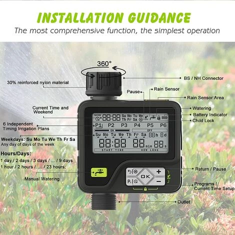 6 programmes à fonctionnement indépendant : Le programmateur d’arrosage intelligent a 6 programmes qui fonctionnent indépendamment les uns des autres. Il peut être arrosé 6 fois par jour, et la durée de chaque arrosage va de 1 seconde à 99 minutes et 99 secondes.