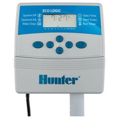 Le programmateur Eco-Logic est doté de fonctionnalités exceptionnelles, telles que la programmation sur simple pression d’un bouton, la fonction Quick Check Hunter, deux programmes indépendants avec quatre heures de départ chacun, un calendrier de 365 jours, un réglage saisonnier (de 10 à 150 %), une compatibilité avec les sondes météorologiques et une mémoire non volatile. L’Eco-Logic est disponible en modèles à 4 ou 6 stations, chacun possédant des fonctions permettant d’optimiser l’efficacité du système. Pour la simplicité, la fiabilité et les économies, rien n’égale le programmateur Eco-Logic de Hunter.