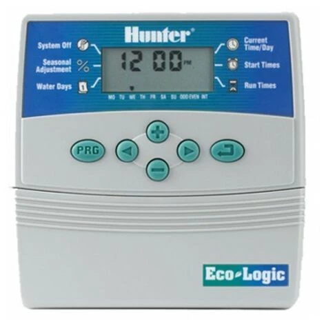 Alimentation programmeur Eco Logic 6 stations Interieur Hunter Le controleur d’irrigation Eco-Logic a des caracteristiques exceptionnelles comme la programmation facile par bouton-poussoir deux programmes independants avec quatre heures de debut chacun, un calendrier de 365 jours, le reglage saisonnier (de 10% a 150%), la compatibilite avec les capteurs de pluie de toute marque et une memoire non volatile. En ce qui concerne la simplicite, la fiabilite et l’efficacite, rien ne vaut la. Eco-Logic Hunter Caracteristiques Nombre de stations: 6 Type: Montage mural Garde-robe: Interieur Programmes independants: 2 (personnalisable) Demarrer fois par programme: 4 (personnalisable) stations d’arrosage heures de pointe: 4 h Compatible avec les capteurs de pluie de toute marque capteur de pluie by-pass Delai pluie programmable: de 1 a 7 jours Cycle manuel Le programme de test permet systeme verifie rapidement memoire non volatile Protection automatique de court-circuit Ajustement saisonnier (total): 10 a 150% Delai entre les stations (maximum): 4 h programmes personnalisables pour simplifier le programmeur electrique Entree transformateur: 230 VAC a 50/60 Hz Transformateur de sortie (24 VAC): 0,625 A Quitter la station (24 VAC): 0,56 A pompe de sortie / vanne maîtresse (24 VAC): 0,56 A