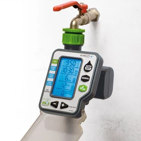 programmeurs Amico tap 2+ sont conçus pour des produits de haute qualité avec la manipulation la plus simple du marché.Le programmeur de Amico est adapté pour les petits jardins avec deux zones d’irrigation.L’unité de commande dispose d’un grand écran 3 » montrant toutes les informations de manière simple et intuitive.L’écran peut être utilisé dans des conditions de lumière faible comme il est rétro-éclairé.Qualité prix exceptionnel.Les programmeurs Amico ont été testées depuis des années, l’amélioration de l’année de produit après année comme l’un des meilleurs programmeurs exploiter le marché à la fois la gestion et la durabilité configuration.Il alimenté par deux piles alcalines de 1,5 V (AA) (non inclus).Caractéristiques Pluie Amico 2programme 1Temps de fonctionnement mini / maxi: 1/240 minutesla fréquence d’arrosage: De toutes les 6 heures jusqu’à 1 fois tous les 15 joursindication à l’écran de l’heure actuelleindication à l’écran du temps de démarrageindication à l’écran de la durée de l’irrigationindication à l’écran de la fréquence d’arrosageindication à l’écran de la prochaine irrigationCompte à rebours pour la durée de l’irrigationAvertissement de batterie faible et le changement de la batterie1 irrigation de la zoneDouille filetée ¾ « -1 »Sortie filetée ¾ « Liens rapides vers les sorties d’eau de tuyauDébit minimum 5 l / minDébit maximal 40 l / minPression minimale 1,0 barPression de travail maximale de 6 barsolénoïde 9 VDCUnité de commande amovible électrovalveCorps en ABSCouverture de haute résistance à la protection de l’écran plastiqueEcran rétro-éclairé 3 « Alimenté par deux piles alcalines 1,5 V (AA) (non inclus)