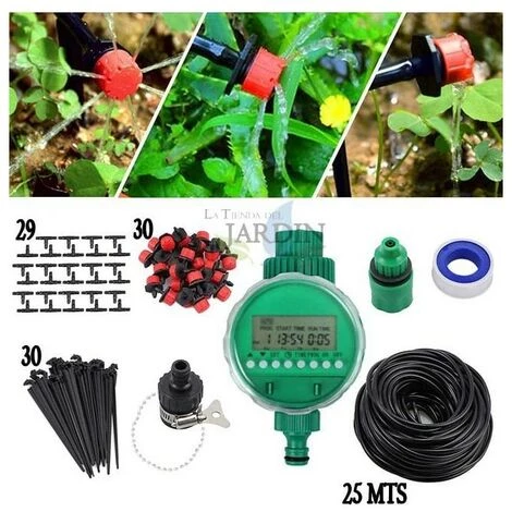 - Le nouveau kit goutte à goutte de bricolage comprend: 1 minuterie d’irrigation + 2 connecteurs de type + tuyaux d’eau de 4 mm de 25 m + 30 goutteurs réglables + 30 connecteurs de type T + 30 crochets simples + 1 ruban Téflon.
