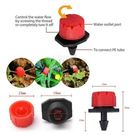 - Les compte-gouttes rouges à débit de 0 à 50 l / h peuvent ajuster le débit d’eau en fonction de la demande en eau de différentes plantes, et la buse peut également couper l’eau.