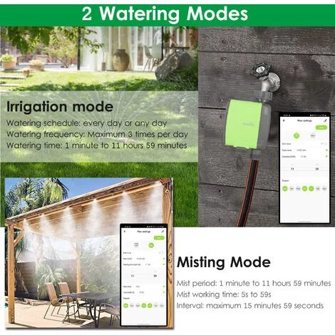 Mode d’irrigation et de brumisation – Le mode d’irrigation et le mode de brouillard sont disponibles pour l’arrosage. Convient pour contrôler le système d’irrigation goutte à goutte, le système d’irrigation à effet de serre, le système d’arrosage pour pelouse de jardin, le remplissage de la piscine, le système de brouillard et d’autres systèmes d’irrigation.