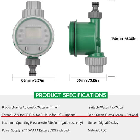 Le contrôleur intelligent d’irrigation de l’eau rend l’irrigation plus facile, plus pratique et plus efficace. La conception à piles et l’écran d’affichage numérique le rendent facile à utiliser. Il convient à l’arrosage des plantes, à l’irrigation agricole, à l’humidification des serres, au dépoussiérage, au refroidissement de la cour et plus encore !