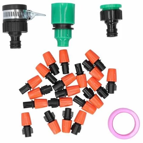 - 1 x 4/7 19 x 4/7 Tuyau Té 2 x 4/7 droit simple connecteur à crochet 20 x buses de pulvérisation 1 x connecteur rapide 4/7 1 x connecteur universel 1 x connecteur de robinet 1 x ruban d’étanchéité 20 x serre-câbles